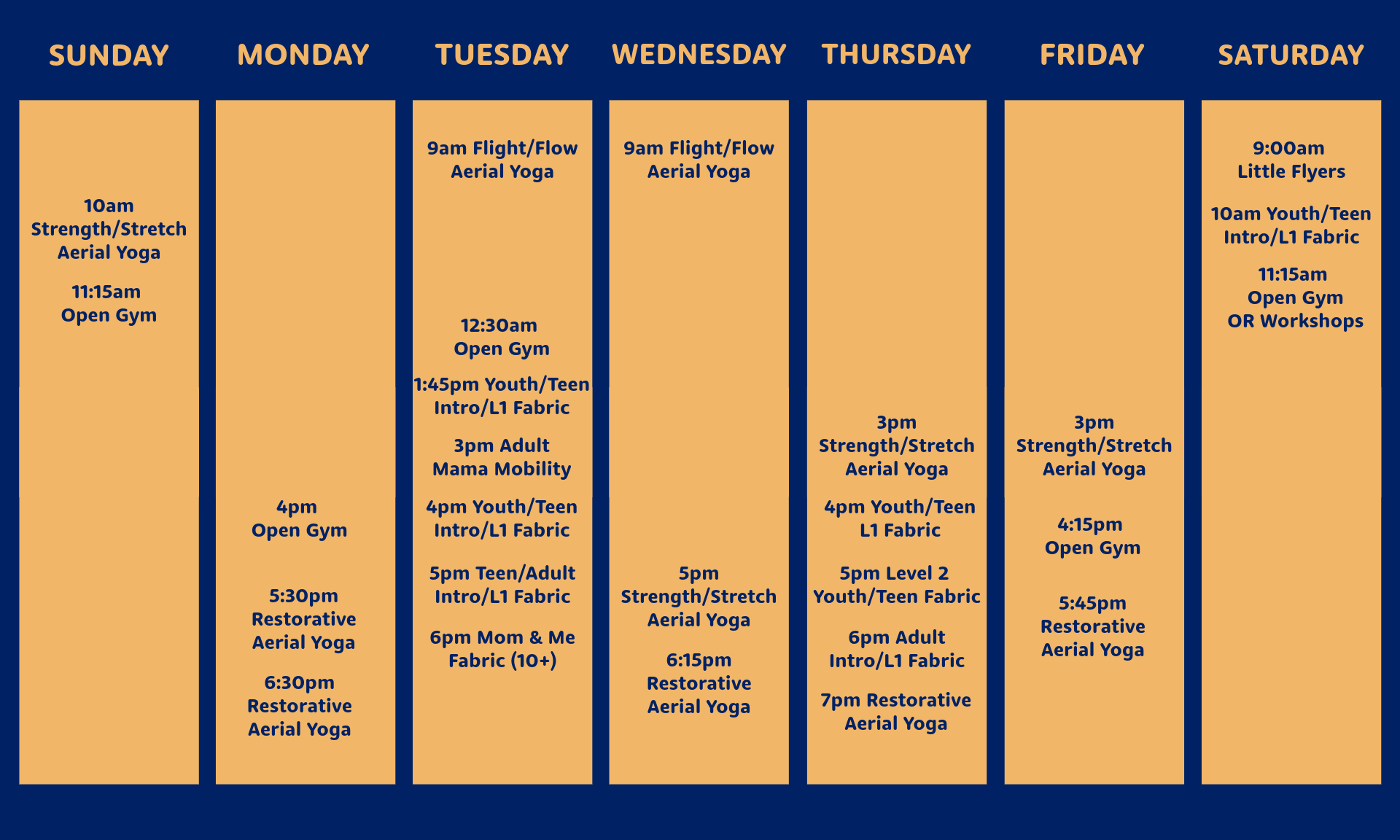 Classes focusing on strengthening the body through full range of motion to create better stability, flexibility, and strength in the body. (Fabric is very rarely incorporated into these classes)
